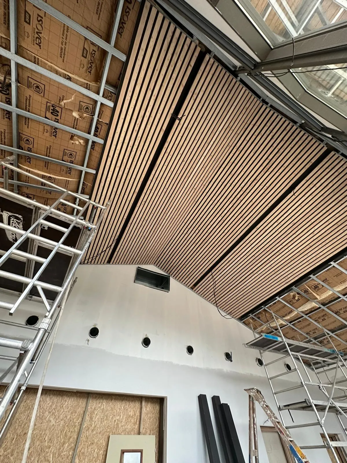Chez MK Menuiserie, nous avons récemment participé à un projet significatif à Janneyrias : habiller le plafond de l’extension d’une école avec un bardage en bois. Cette intervention visait à transformer cet espace, destiné à devenir le réfectoire de la cantine, en un lieu accueillant, fonctionnel et esthétique pour les élèves.