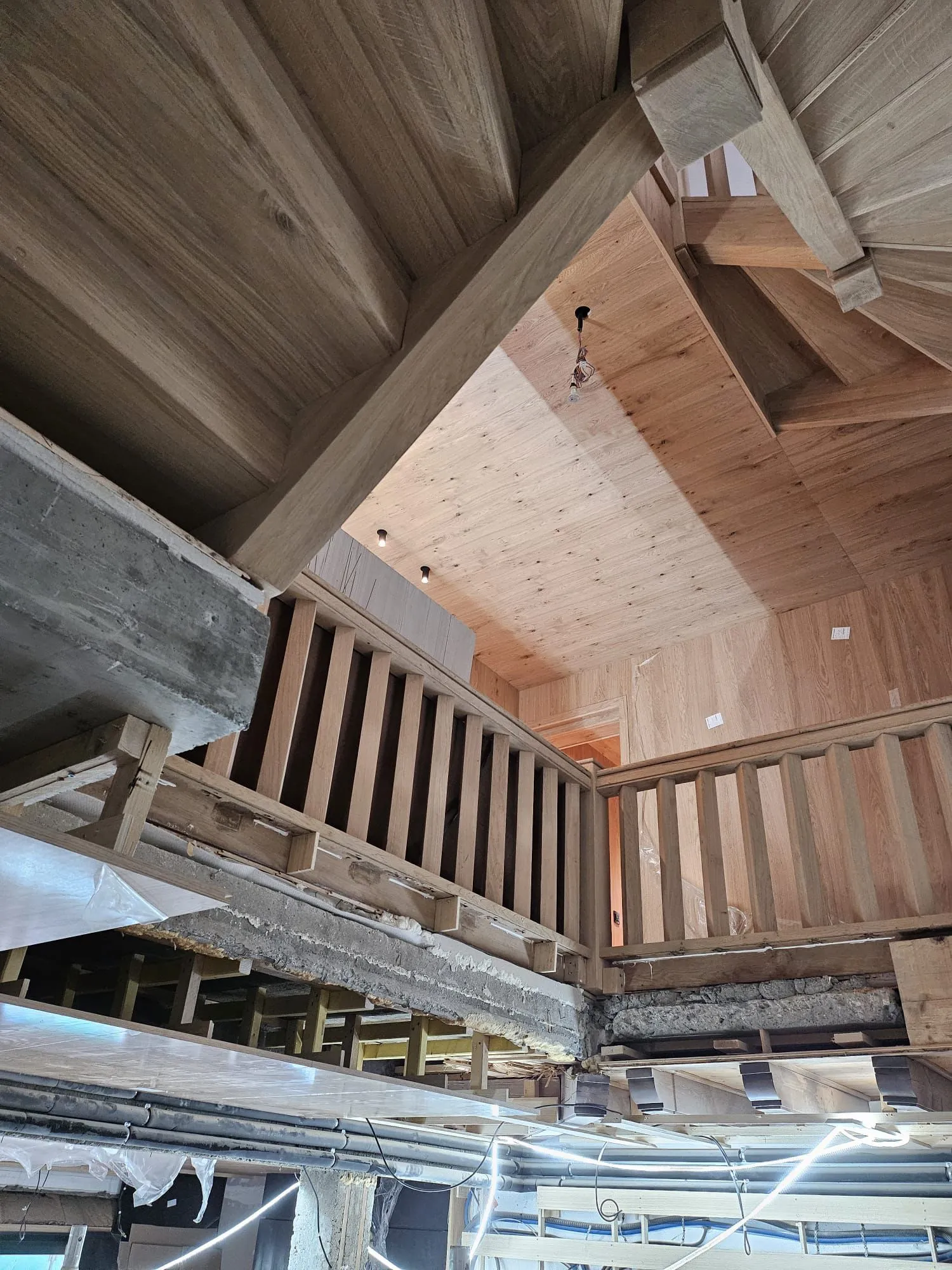 Nos artisans ont habillé les murs et plafonds de chaque étage avec un bardage en bois soigneusement posé pour garantir un alignement parfait et un rendu esthétique uniforme. Les défis techniques, tels que les jonctions entre les murs et plafonds, ainsi que les angles spécifiques liés à la structure du chalet, ont été surmontés grâce à une précision d’exécution.Intégration fonctionnelle